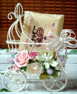 乳母車のバスケットに載せて