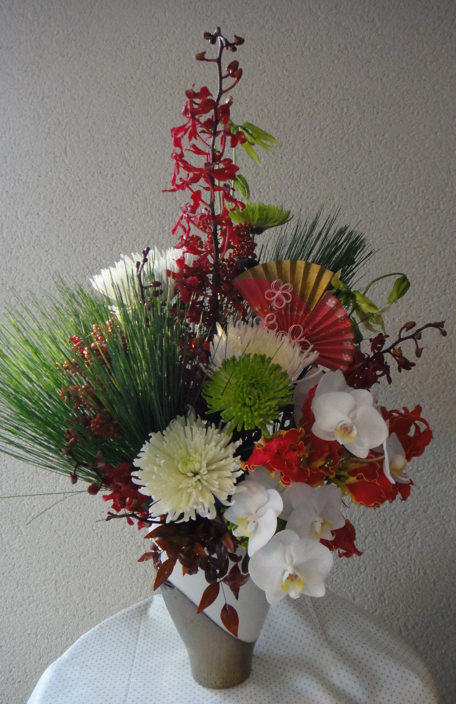 紅白のお花で華やかに賑やかにお作りいたしました。