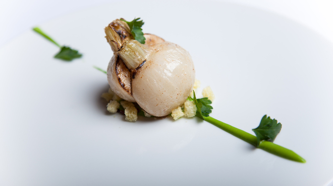 抱擁の秋〜ハタの炭火焼き、舞茸、銀杏、根セロリのピュレと焦がしたラルドのオイル