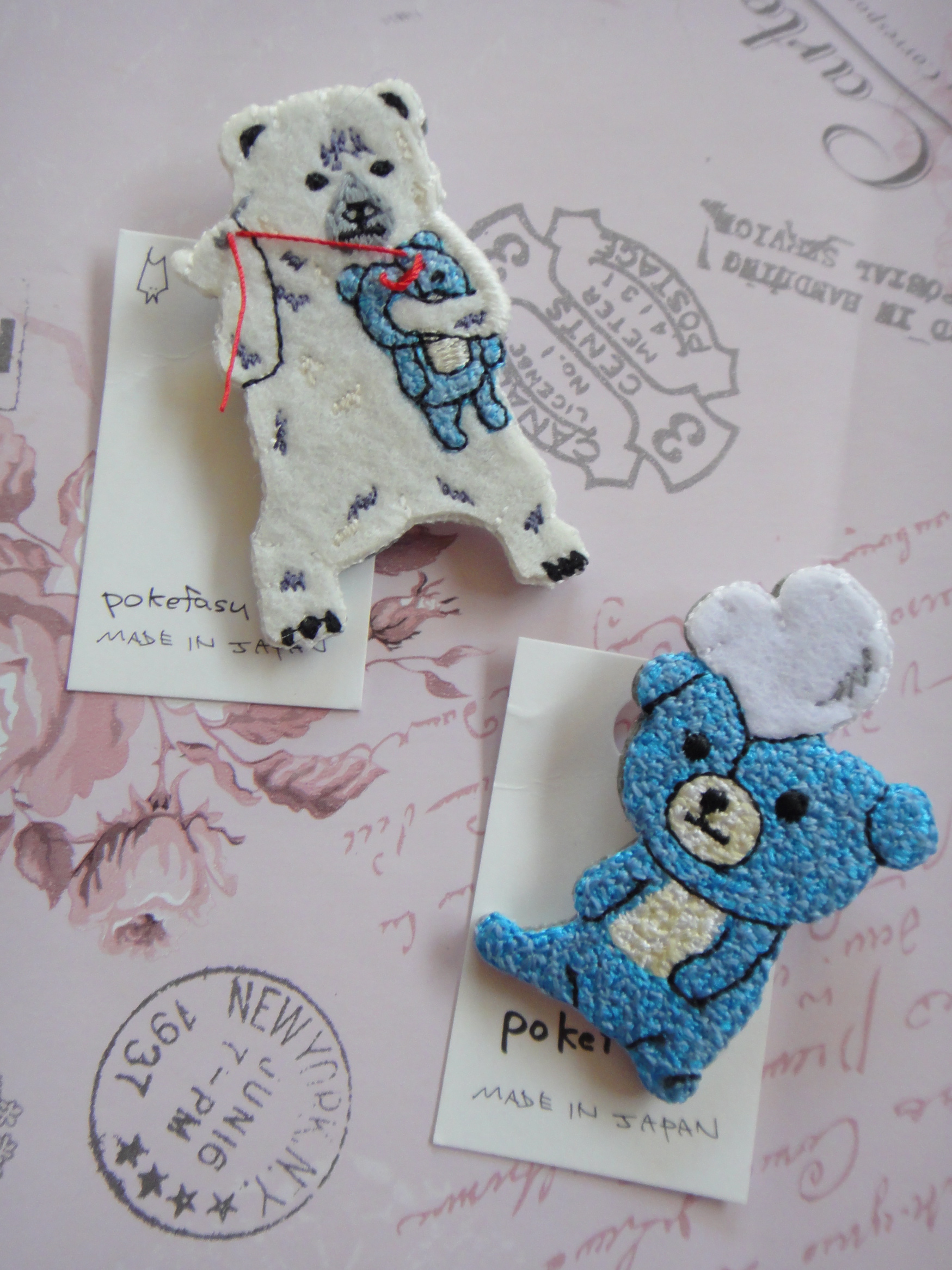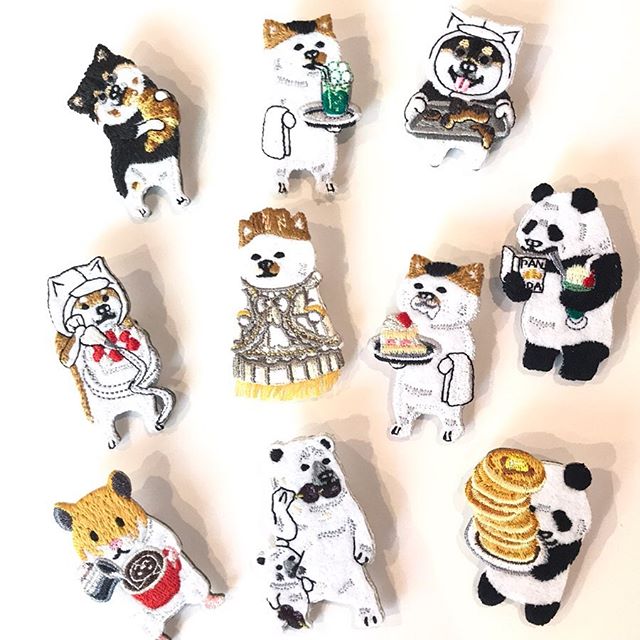 野性的なくまがクマのぬいぐるみを縫っている刺繍のブローチです♡
