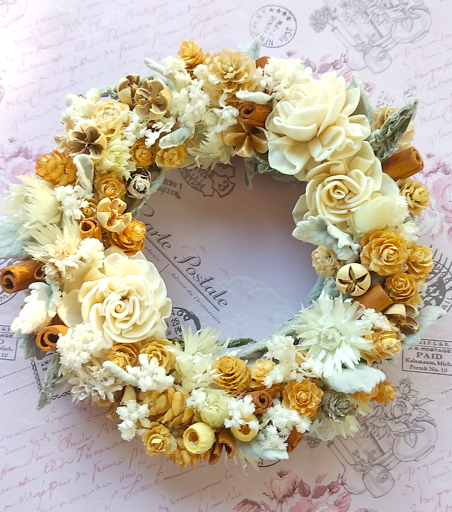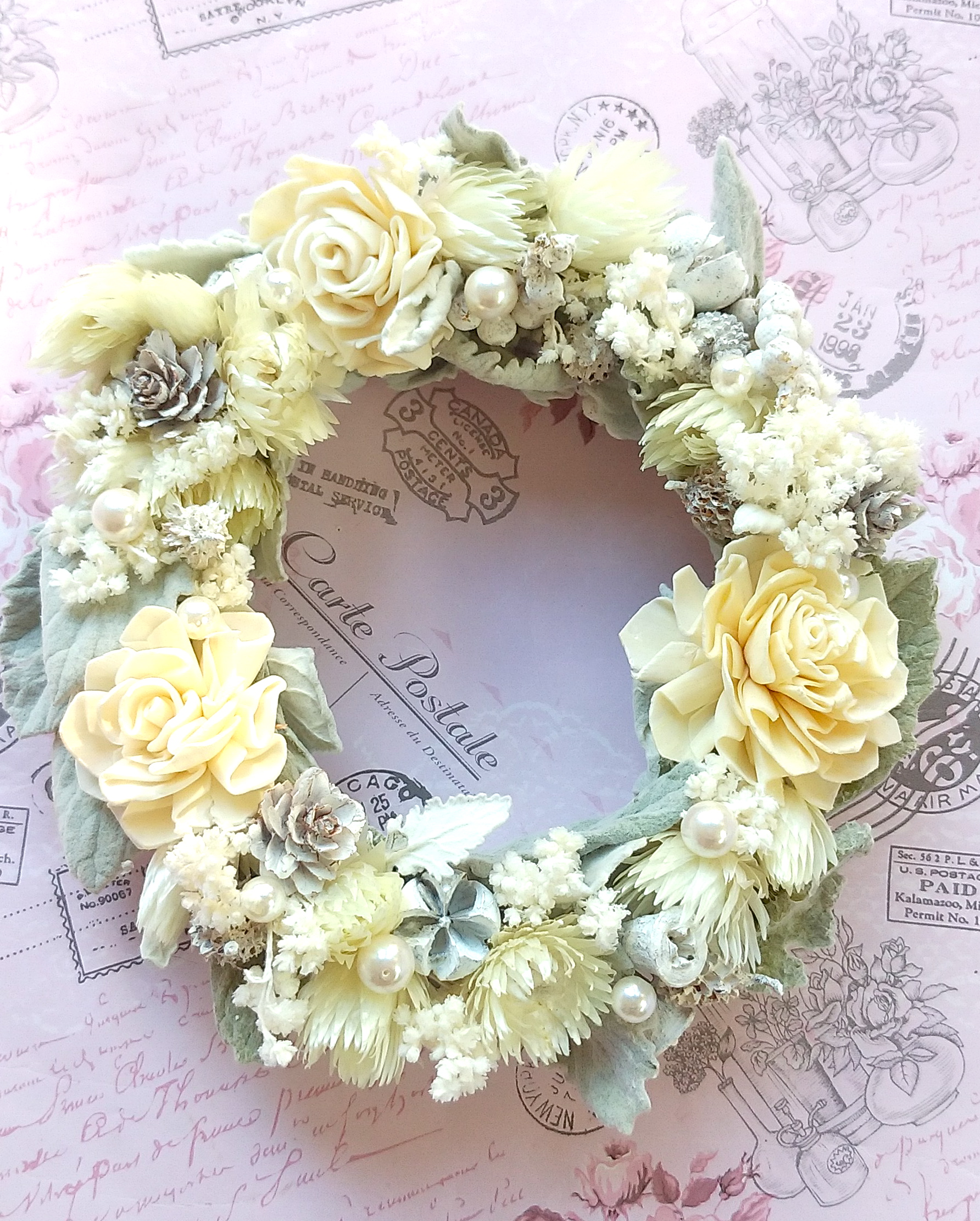 白&アイボリー&ミルク色のほっこり優しいリースです。