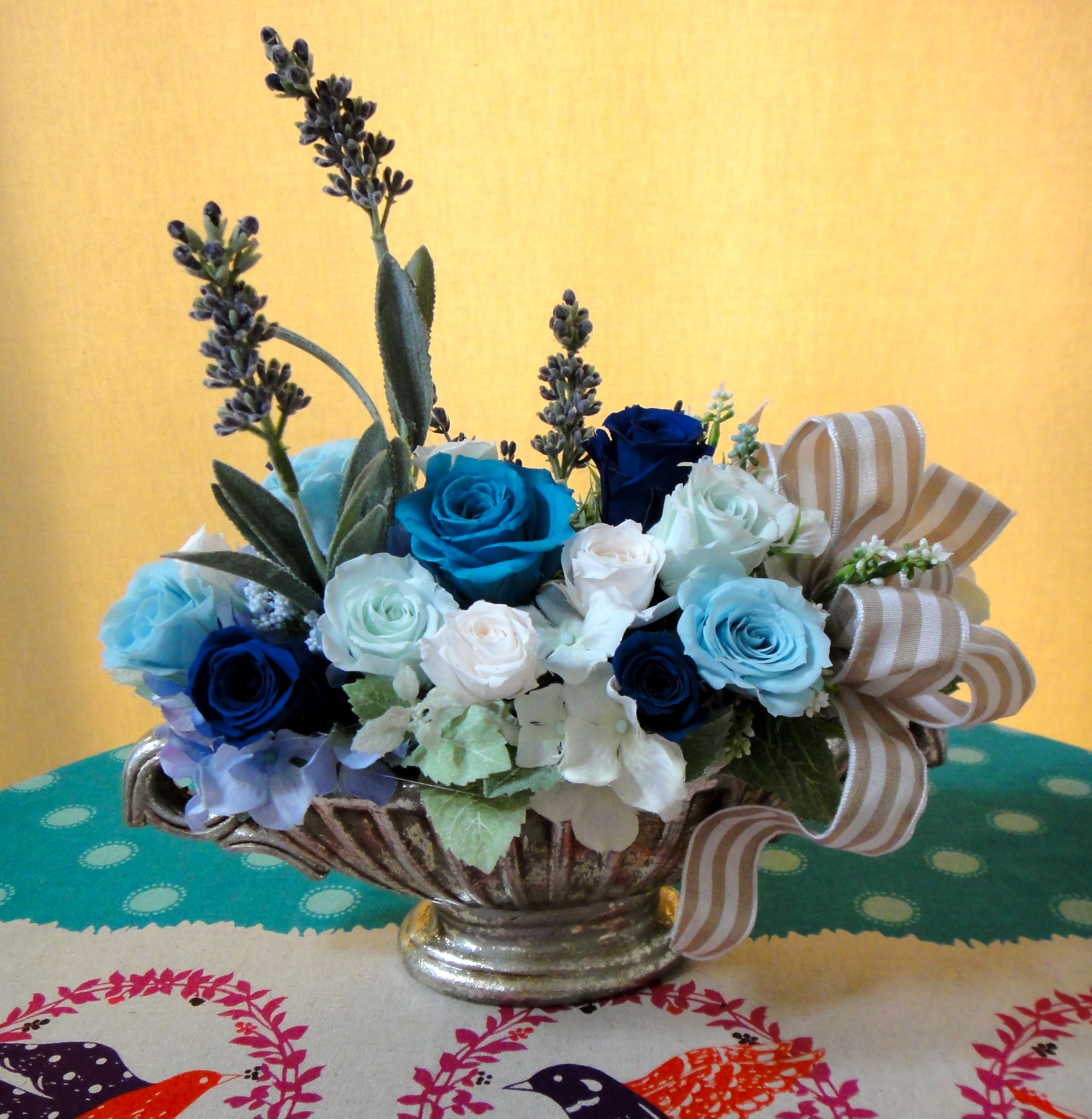 青いバラでアレンジいたしました。