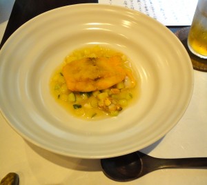 三重のすずきと山梨「まごころ農園」の野菜たち 蕪と空豆のソースで